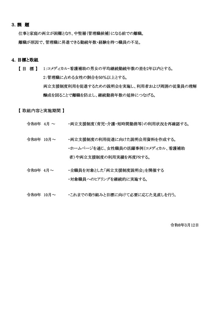 職員が仕事と子育てを両立することができ、職員全員が働きやすい環境を作ることによって、すべての職員がその能力を十分発揮できるようにするため、次のように行動計画を策定する。